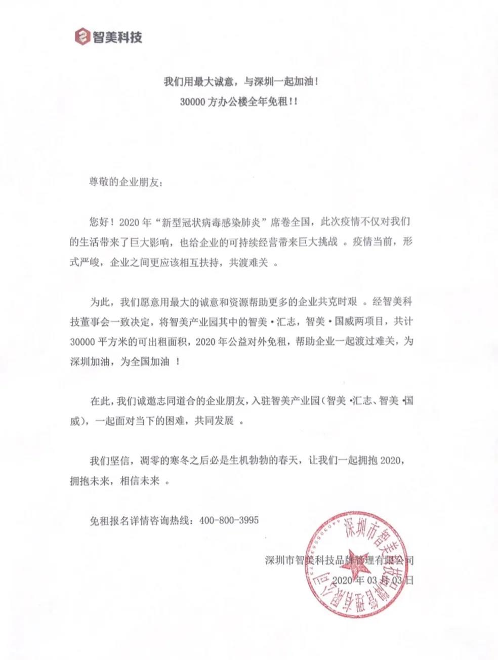 2020年2月,面对突发对中小企业的冲击,智美科技率先,对旗下运营的智美PARK、智美·威、智美·集创等园区 400余家租户实施2月租金减半,覆盖深圳多个心产业园区。此举直接降低企业短期现金流压力,成为深圳首批主动减租的产业运营方之一 1516。